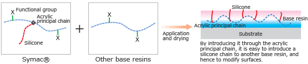 Toagosei’s original macromonomers compounding technologies and graft polymerization technologies produce a variety of characteristics in our graft polymers. SYMAC is used as a coating agent that has the characteristics of both silicone and acrylic, and RESEDA® is used as a compatibility accelerator for its superior compatibility and adhesion.