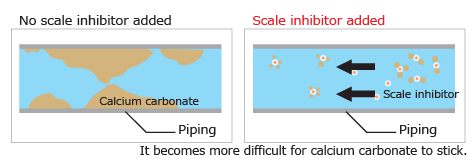 Scale refers to the insoluble salts that have crystallized and separated on the surfaces of walls of machinery, when oversaturated with cations like calcium, magnesium, iron, and barium and anions like carbonic acid ions, hydrogen carbonate, sulfuric acid ions, and silicic acid ions in the water because of heating, cooling, or changes in pH. In the circulating water systems of heat exchangers like cooling towers, boilers, and steamers on building rooftops, the occurrence of scale can cause a variety of damage, including corrosion and blockage of piping, water leaks, and reductions in heat efficiency. Scale inhibitors are used to avoid such problems.