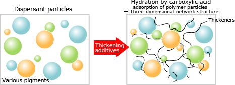 The thickening mechanism has been explained as being caused by the formation of hydrogen bonds to carboxyl groups and water molecules, and structural viscosity owing to the three-dimensional network formed by the thickener polymer’s adsorption to pigment particles. While there are differences due to the size, quantity, and the affinities and the like of pigment particles in the system, it is possible to impart a so-called thixotropic quality that destroys the three-dimensional network structure by shearing stress and lowers viscosity. This property is widely used to improve the applicability of water-based paints, latex, compounds, etc.