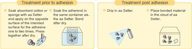 Pre-soak primer with absorbent cotton or felt, and wipe the adhesion surface one or two times. Bond using Aron Alpha® once the primer has dried. If the primed surface is left without adhesion for a long time, the performance may not be evident due to factors such as temperature and humidity. Be sure to bond the primed adherend as soon as possible.